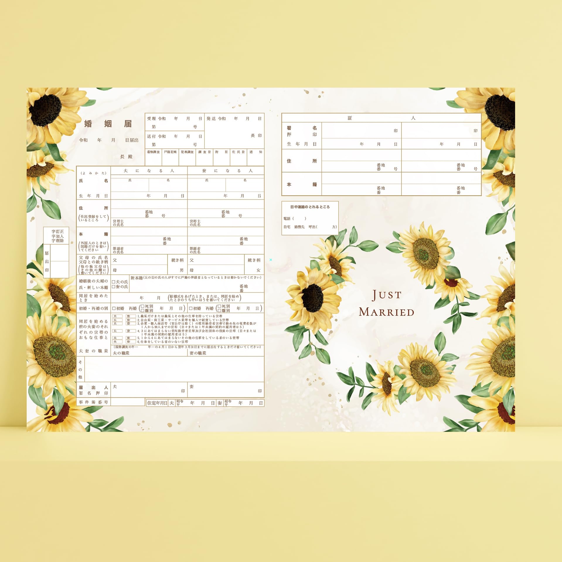 名入れ 婚姻届ひまわりの婚姻届向日葵お花夏シンプルおしゃれ 役所へ提出できる婚姻届YUIAI おしゃれで可愛いデザイン婚姻届・出生 届。