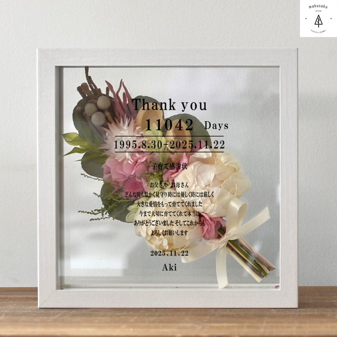 結婚式 子育て感謝状2点セット 両親贈呈品 ドライフラワー 子育て感謝状 入籍 結婚 結婚式 両親贈呈品 両親に贈るプリザーブドフラワードライフラワー ブーケ プレゼント 家族 名入れ 両親贈呈品 ウエディング ギフト 新婚 花嫁ホワイトフレームブーケ1個 -makusaku。
