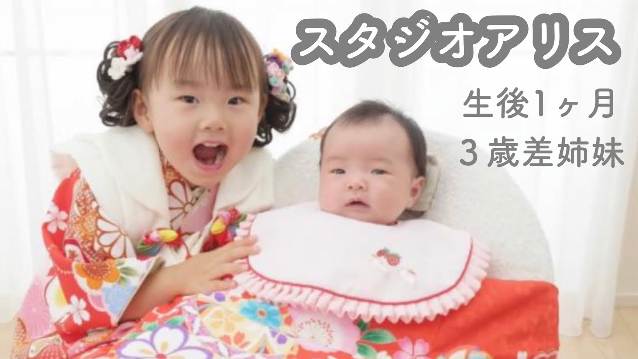 生後1ヶ月 スタジオアリスにてお宮参りフォト3歳差姉妹。
