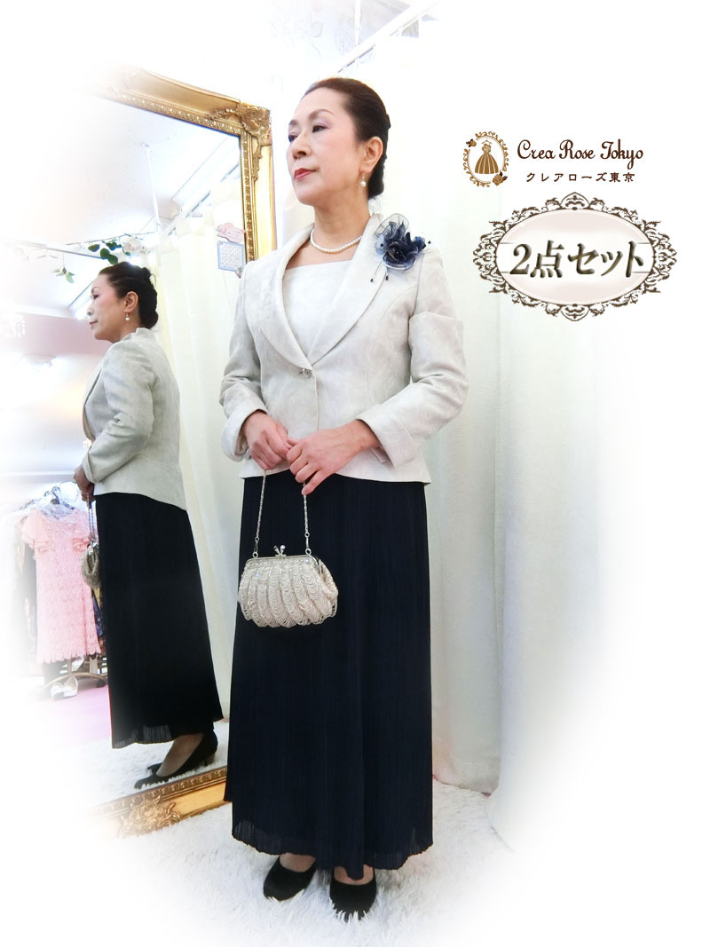 50台の叔母様ロングミディアムフォーマルドレス サンテ・クワイエ+フレンディジャケットブラック 黒 ・ベージュ 叔母様 が輝くコーディネートのレンタルクレアローズ東京・クレアローズ横浜。