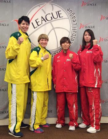 JX渡嘉敷来夢、V7に意欲 バスケWリーグ決勝前会見写真撮影でポーズをとる 左から JX―ENEOSの渡嘉敷来夢、吉田亜沙美、富士通の町田瑠唯、山本千夏=25日、東京都内のホテル四国新聞社。