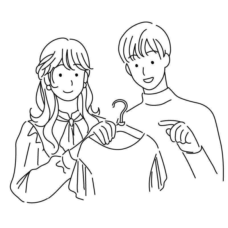 買い物デートで服を見るカップルの手描き線画イラスト – Tegaki-stock。