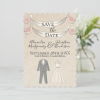 ヴィンテージ図解入りの、写真付きの新郎新婦の日付の保存 招待状Zazzle.co.jp。