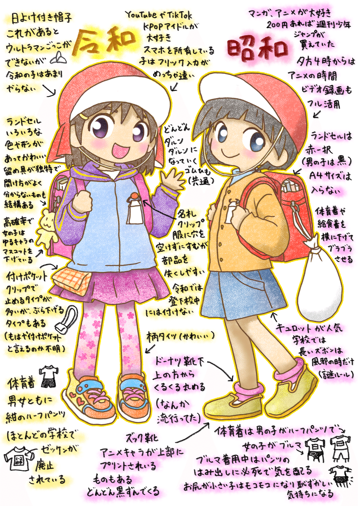 小学生 令和・昭和の小学生を比較するイラストtk。