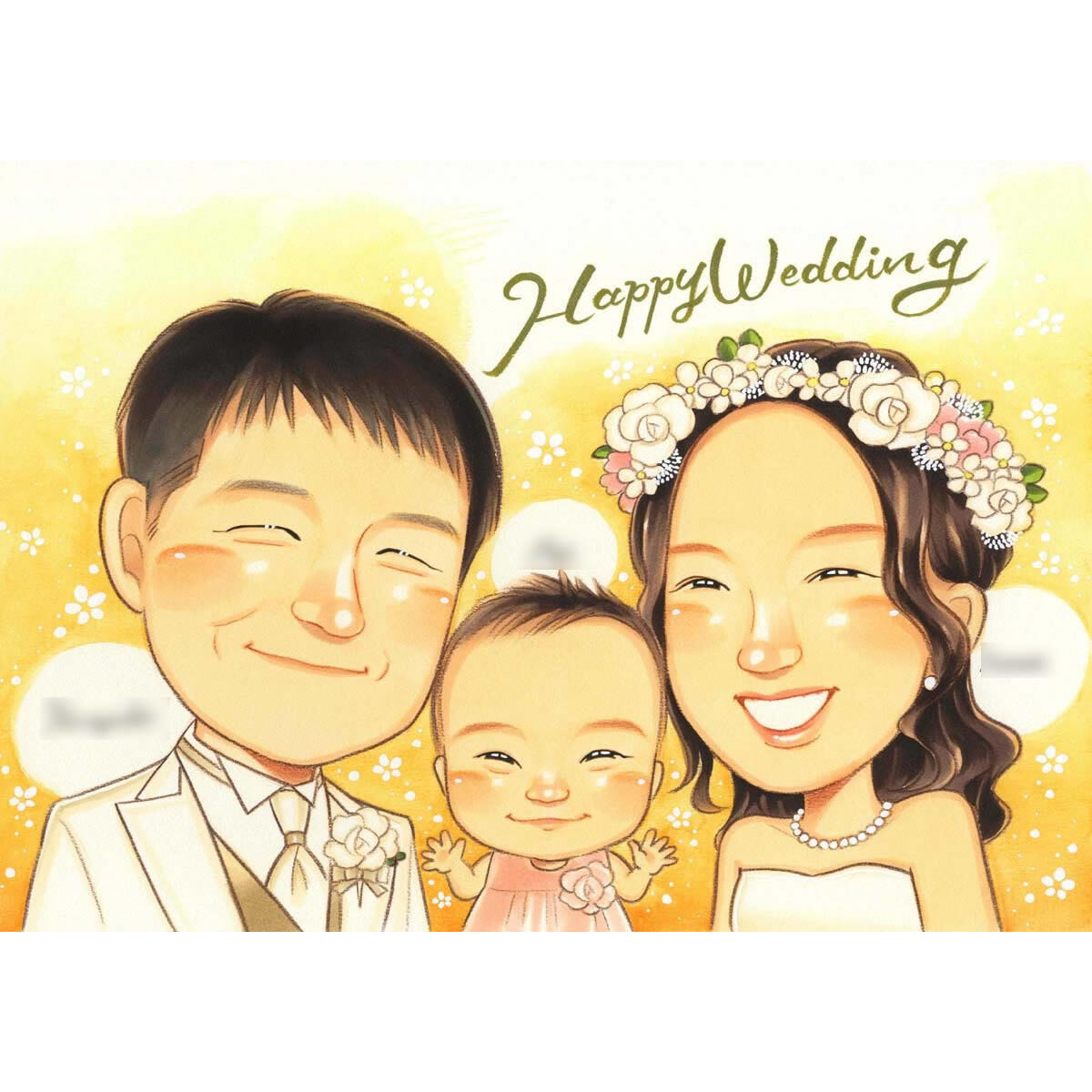 親子で楽しむウェディング似顔絵 新郎新婦と子どもと一緒に描かれたかわいいタッチのウェルカムボード 家族で共にお祝いを迎える思い出に。新郎新婦と子ども の幸せそうな姿が描かれた贈呈用ボード!幸せを届けるプレゼントとして喜ばれること間違いなし。 -似顔絵。