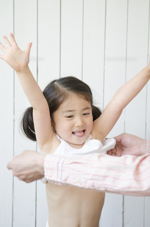 お父さんに着替えを手伝ってもらう女の子の写真素材FYI01703974ストックフォトの Qlean Market キュリンマーケット。