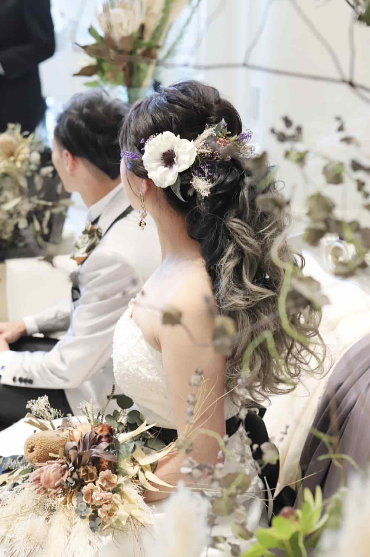 ゆるふわシニヨンの可愛い花嫁ヘア ♡ ドライフラワーの髪飾りも可愛いです😍 ୨୧୨୧ \\ 4 18 日ウェディングフェア開催!ドレス試着、演出体験、アイテム展示などプレ花嫁参加マストのウェディングフェアです! ※事前予約制。
