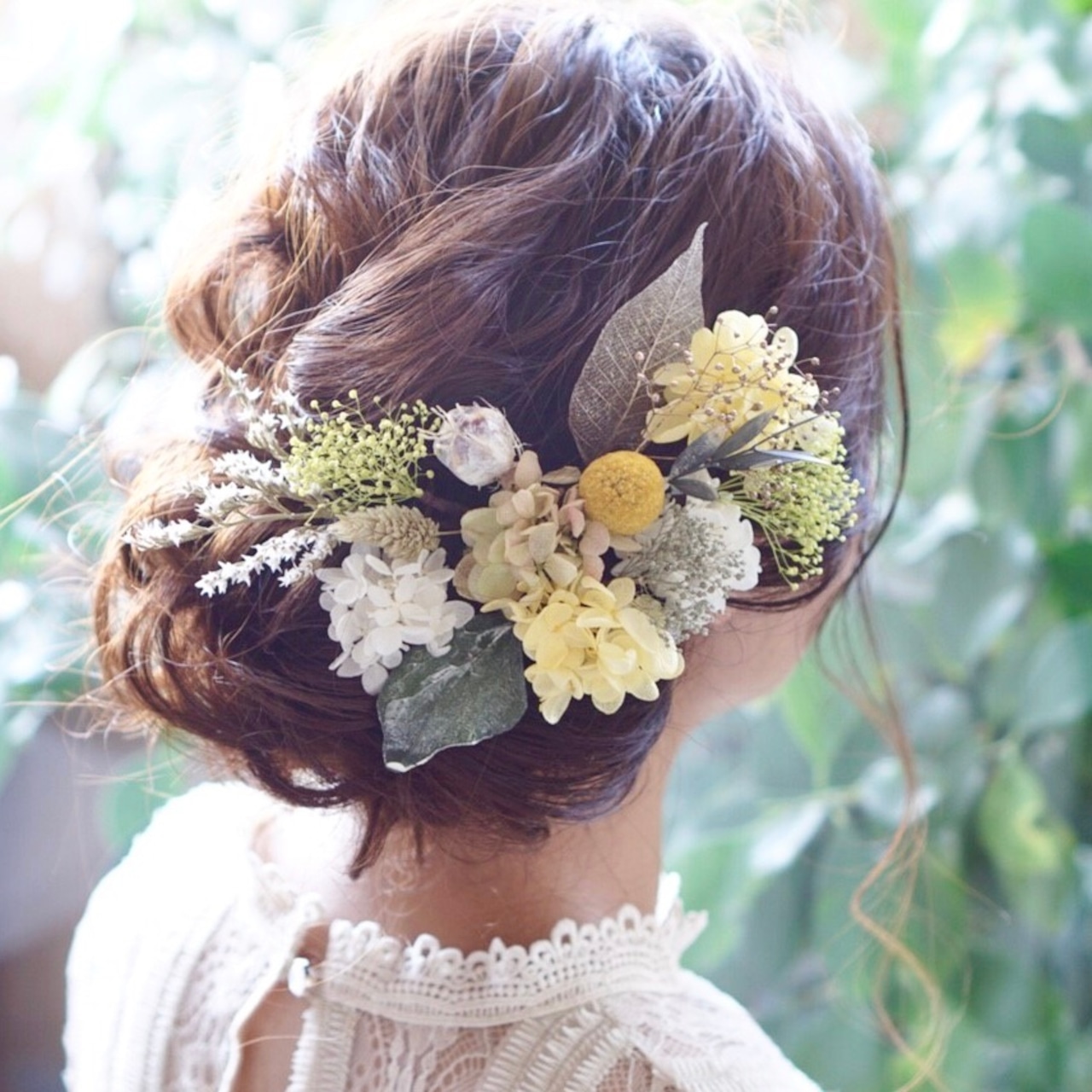 楽天市場 ウェディングヘッドドレス 花モチーフ 立体花 フラワー 結婚式 髪飾り 前撮り 二次会 発表会 演奏会 ブライダル パーティー 花嫁小物披露宴 着物 和服 ウエディングヘアアクセサリー ヘッドアクセ 和装 成人式 海外挙式 ホワイト イエロー ヘアコサージュ ヘア。