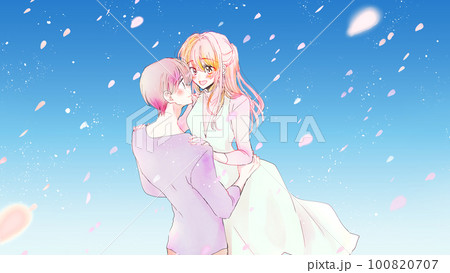 幸せそうな男女カップル 抱っこ 桜吹雪のイラスト素材100820706- PIXTA。