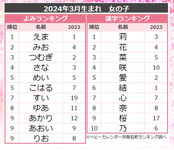 春らんまん「サクラネーム」や「フラワーネーム」など花にまつわる名前が増加、大人気!2024年『3月生まれベビーの名付けトレンド』発表!株式会社ベビーカレンダーのプレスリリース。