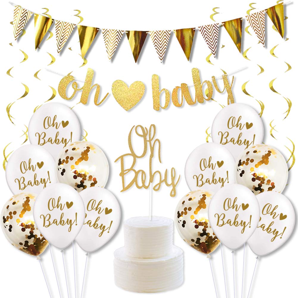 ベビーシャワー 飾り セット パーティー 装飾 男女通用 ゴールド バナー ガーランド 渦巻きバナー ケーキトッパー ケーキピック ラテックスバルーン風船 紙吹雪入れ バルーン 28枚セット。