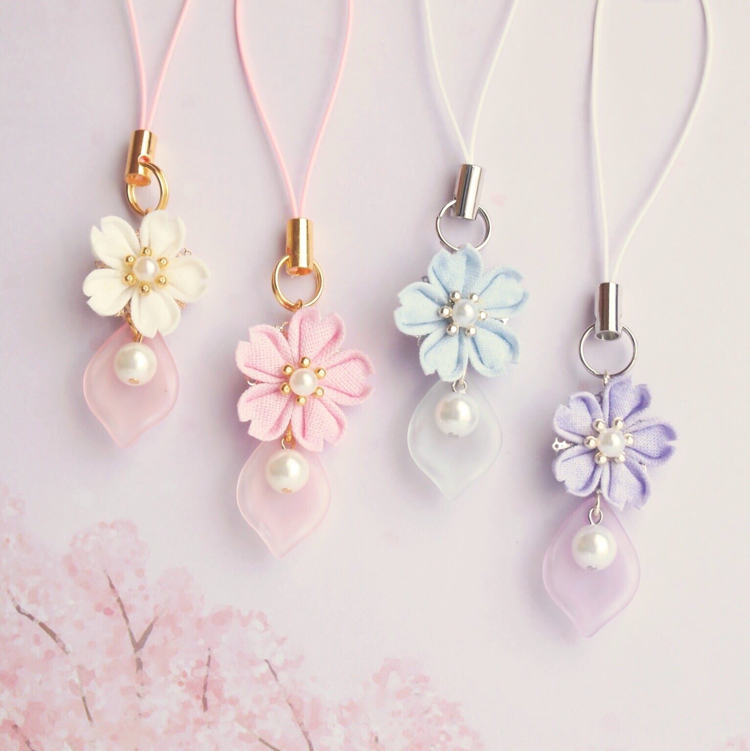 つまみ細工 サクラ咲く*桜と花びらのストラップ---- フラワー 誕生日 記念日 プレゼント 縁起物 合格祈願 キーホルダー パール さくらつまみ細工のお店 花色小町。