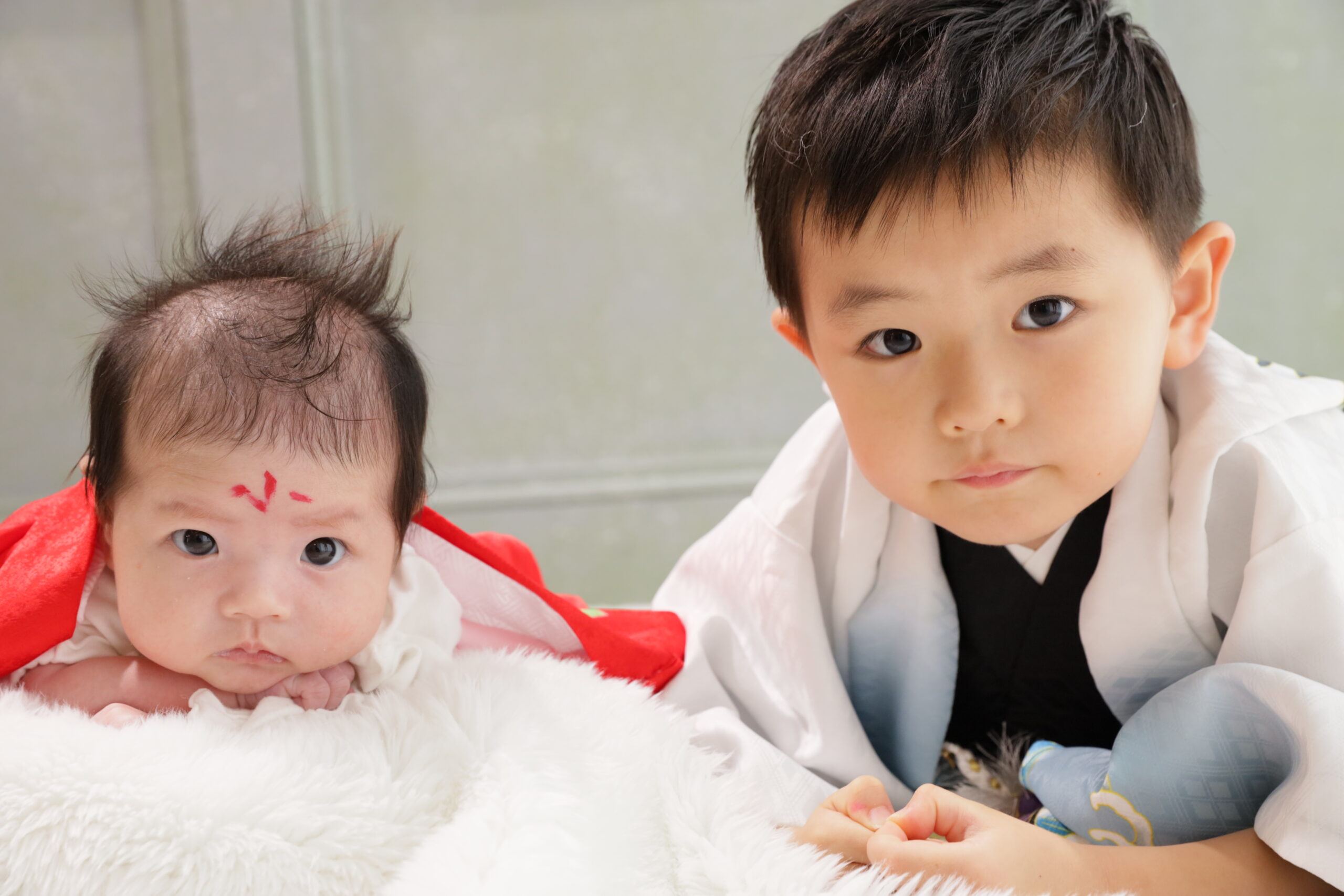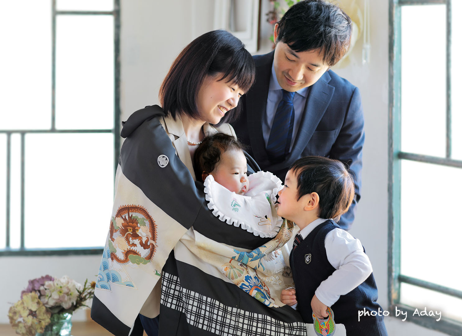 優しいお兄ちゃんと一緒に🍀初宮参りおめでとうございます!初宮参り・七五三なら「水天宮前写真館」お宮から徒歩1分のフォトスタジオ。