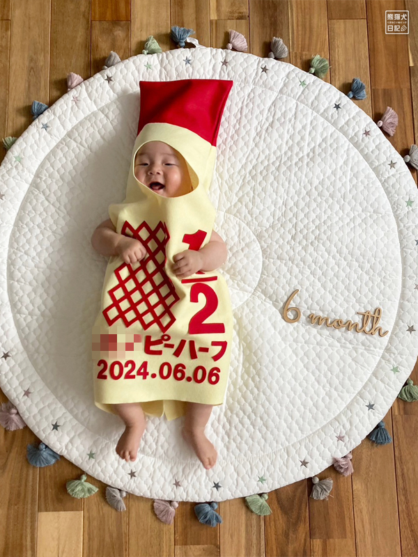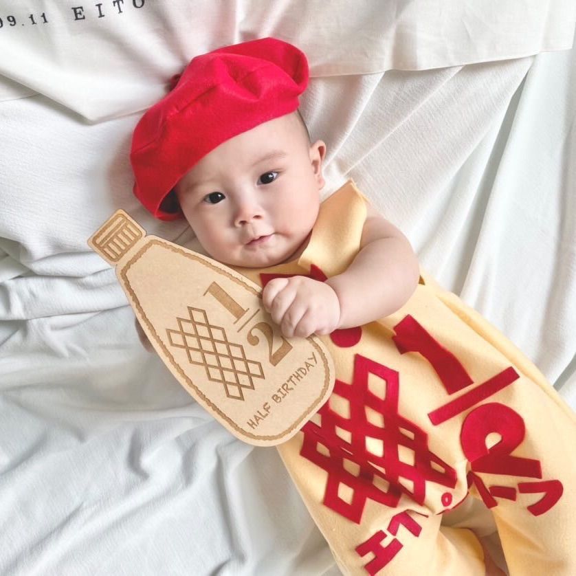 mamagirl_jp ハーフバースデーを手作りキューピーマヨネーズコスでお祝い💓 すっぽりハマってめ〜ちゃっ可愛い⭐️✨ @kotomi5312さんの投稿を引用させていただきました✍️ ・ 最後は アラピーハーフ.ᐟ.ᐟ👶🏻 作ると思って。