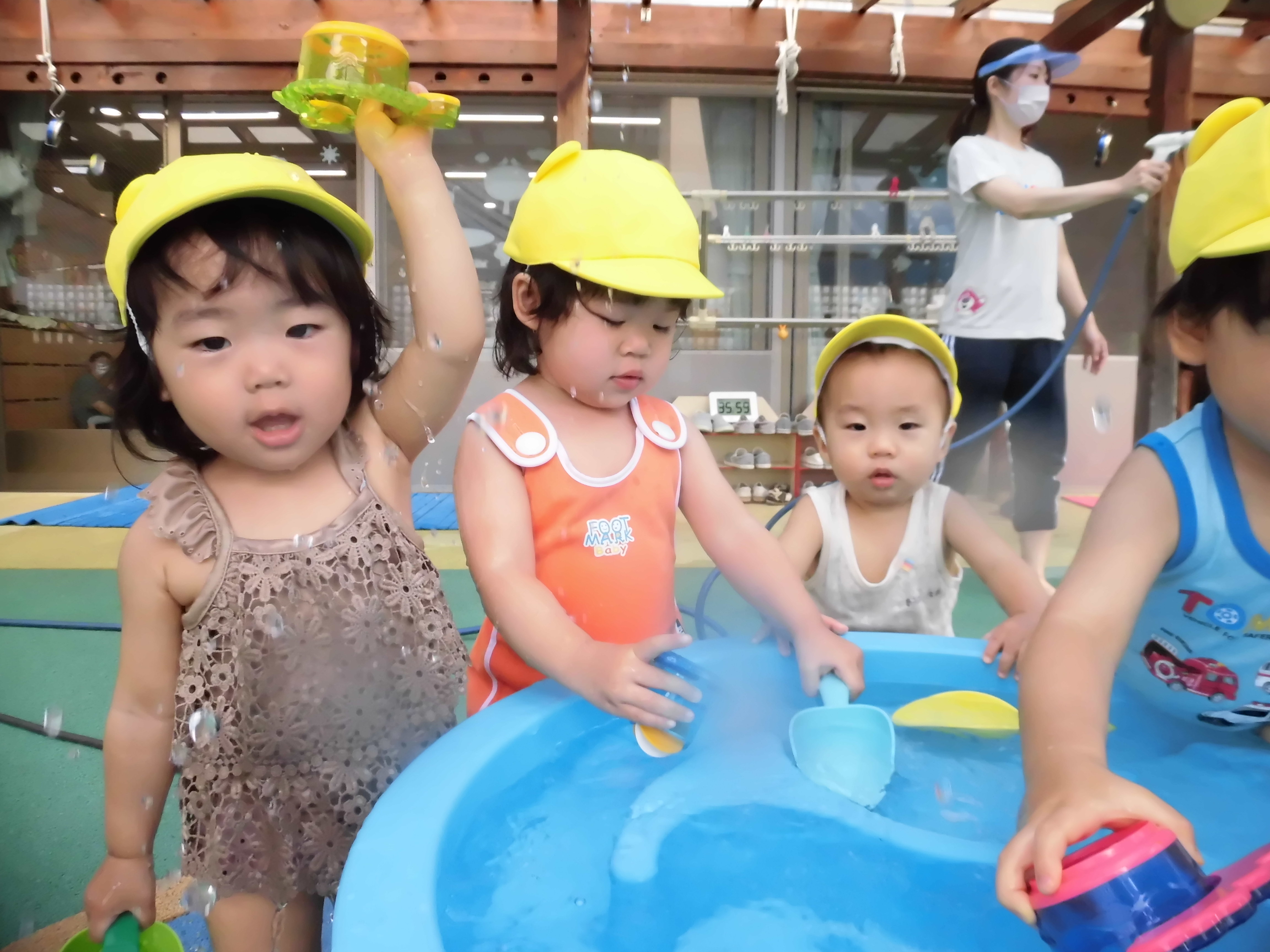 1歳児りす組です。 水遊びが始まり毎日水遊びを楽しむ子どもたちです。積極的に水に触れて水の感触を楽しんでいます。夏ならではの遊びをみんなで楽しんでいきたいと思います。葛飾区新宿保育園保育士。