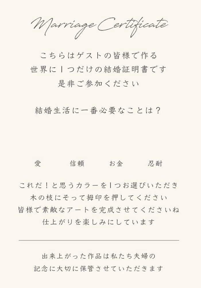 Amazon婚式 少人数〜50名規模 A4 ウェディングツリー ゲスト参加型 結婚証明書 A5説明書付き 凸凹質感 高級マーメイド紙使用ウェルカムスペース に飾ってね!ゲストブック・芳名録文房具・オフィス用品。