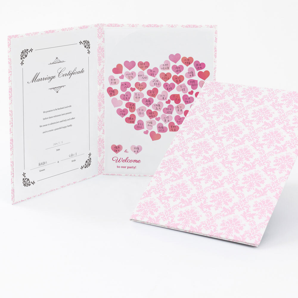 結婚証明書 ゲスト参加型 サイン 誓約書 誓いの言葉 チャペル式 結婚式 挙式 人前式 パーティかわいい 結婚証明書 ハート サイン式ダマスク柄 友人・ゲストと一緒に作る証明書 台紙 ゲストのサイン アート 様々な式で使える結婚証明書 オリジナル 日本製。