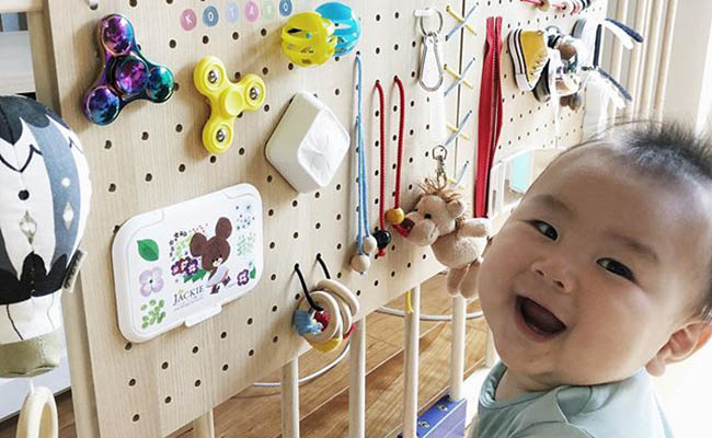 100均アイテムで作れる!「ビジーボード」赤ちゃんが夢中で遊ぶようすも併せて紹介ママリ。
