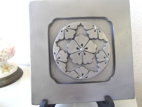 現代の名工」を受賞した、山口茂さんの造った、瓦土製の家紋を、敬老の気持ちとしてもらいました。松葉博雄の社長研究室。