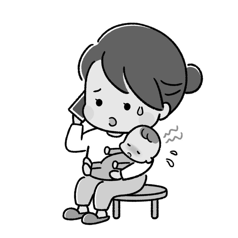 赤ちゃんが発熱して病院に電話を掛けるお母さんイラスト。