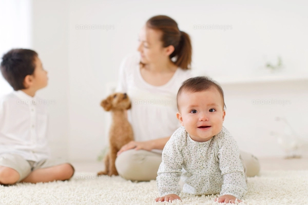 リビングでくつろぐ赤ちゃんとお母さんとお兄ちゃんと犬の写真素材FYI02027696ストックフォトの QleanMarket キュリンマーケット。
