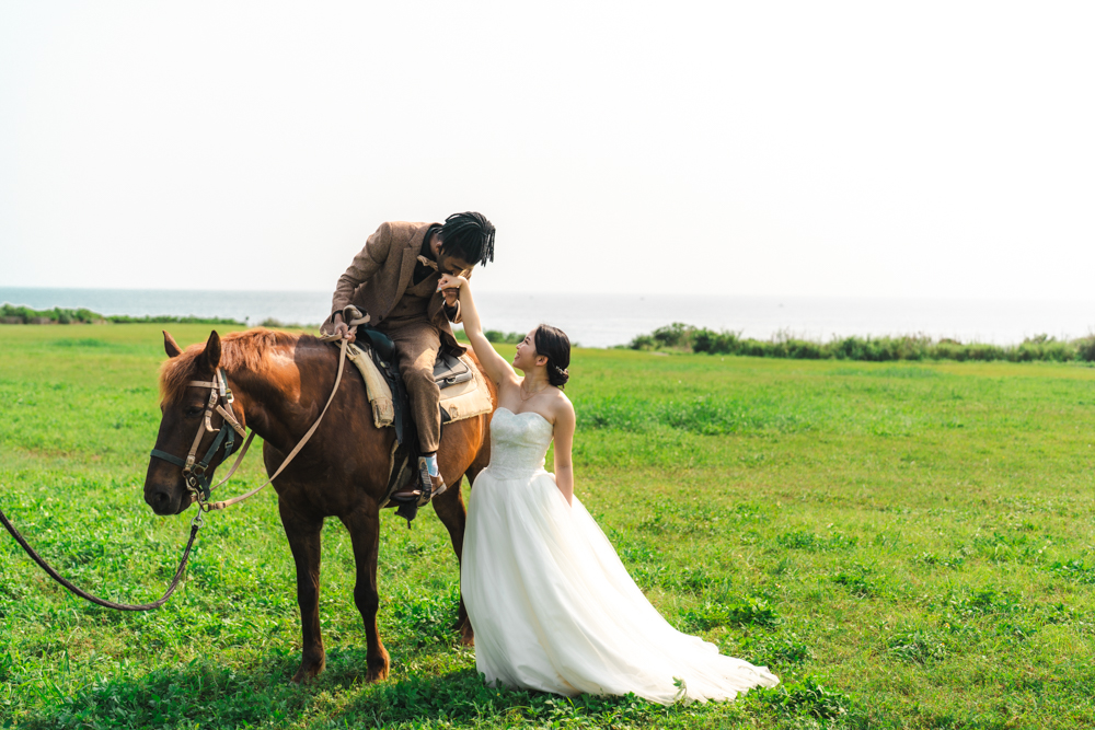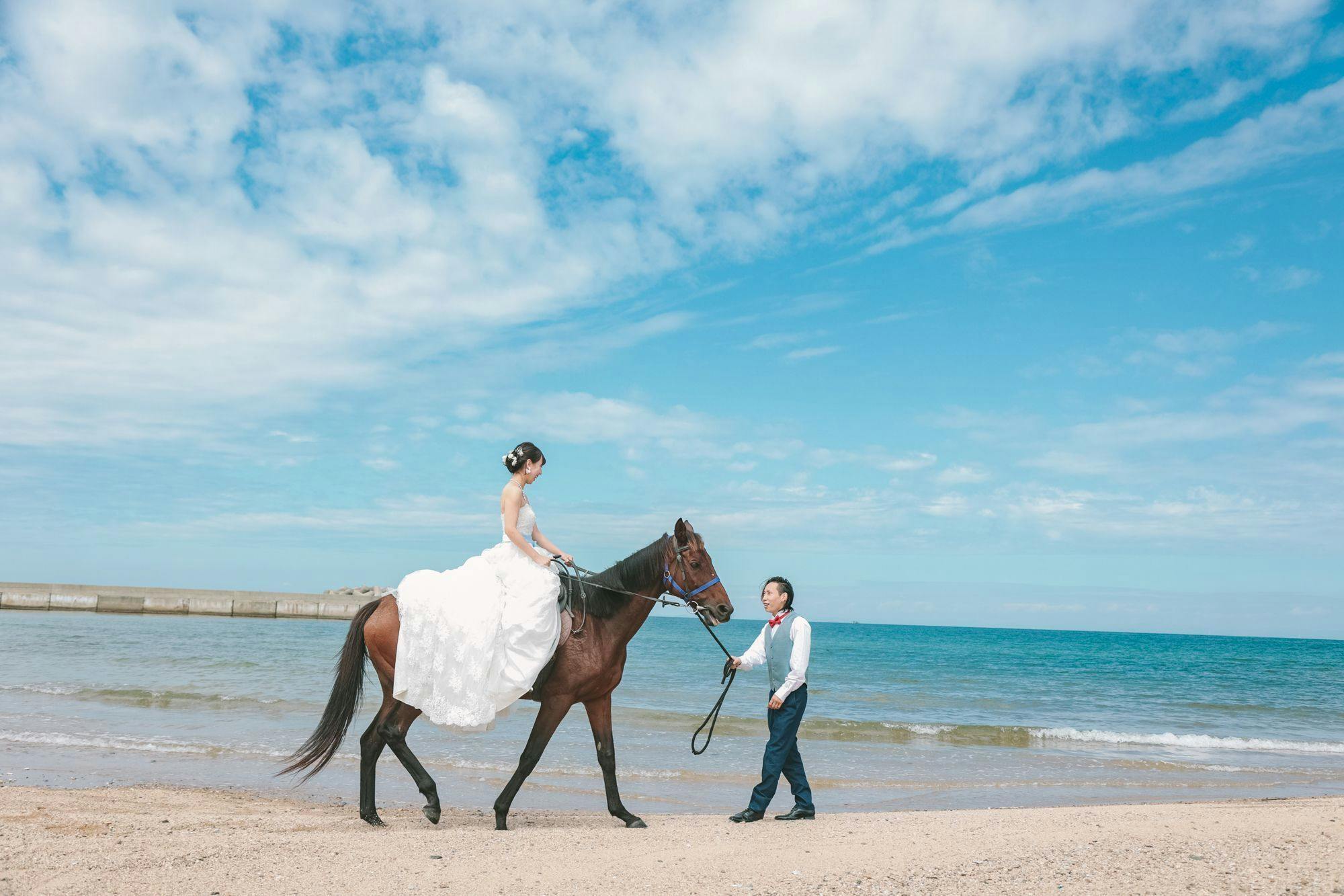 馬 厩舎+草原 &ビーチフォトプラン 全カットデータ付沖縄Webで完結!簡単・気軽に挙式とフォトウェディングするならEASY byWATABE WEDDING。
