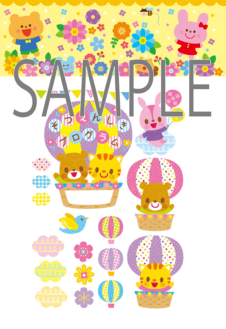 壁面飾り工房本店 壁面装飾・パネルシアター・ペープサート・型紙・知育・保育・介護商品の販売☆壁面飾り工房 横200cm 「気球の上からおめでとう!」3月4月 春 入園式 卒園式 幼稚園 保育園 学校 病院 施設 知育 壁面装飾 型紙 製作☆。