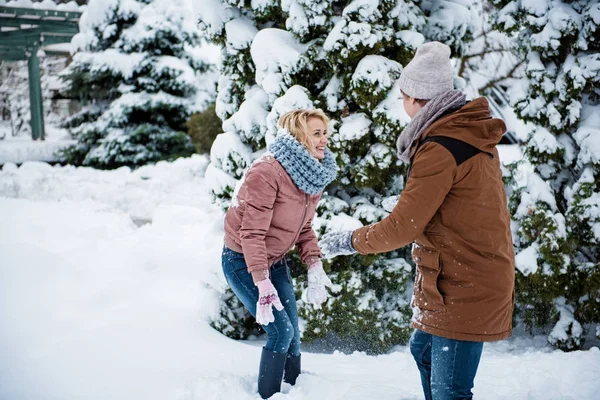 陽気なカップルの冬の公園で雪で遊ぶこと — ストック写真 © iakovenko123181074020。