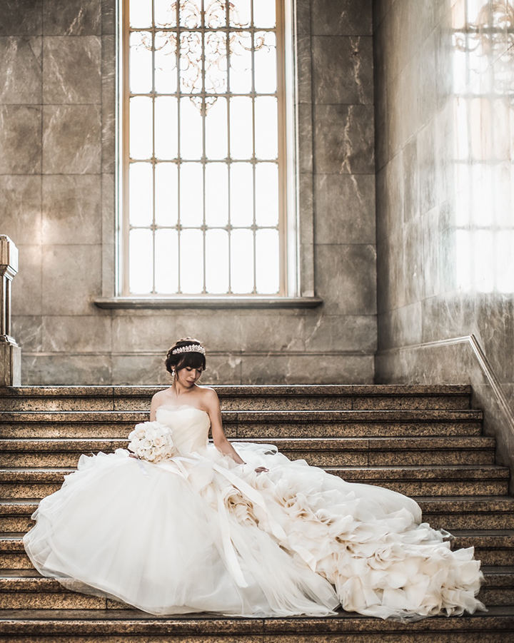 ウエディングドレス フリルマーメイドドレス 結婚式 前撮り トレーン×階段」は無敵! 写真映え。