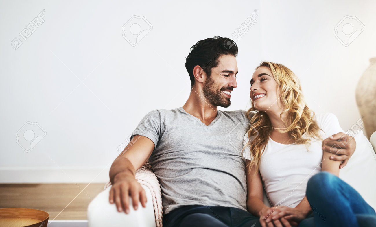 笑顔、リラックス、または幸せな夫婦 が家のソファで抱きしめたり、信頼や忠誠心を持って微笑んだりします。笑顔、恋人、または女性は、週末の休暇中にソファでロマンチックな男性と充実した時間を楽しむの写真素材・画像素材Image 204423141。