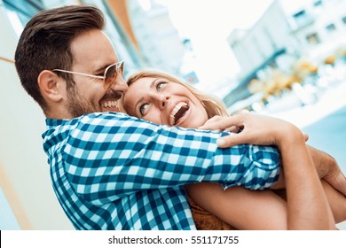 外で楽しみ、笑顔を楽しむ幸せな夫婦。写真素材551171755Shutterstock。