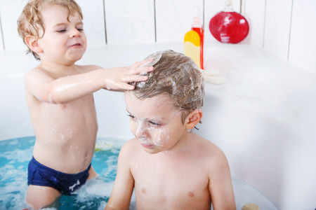 幸せな兄弟:自宅の浴槽でお風呂に入って水と一緒に遊んでいる2人の小さな健康な双子の子供たち。一緒に楽しんでいる男の子。シャンプーで頭と髪を洗う子供たち。の写真素材・画像素材Image 174776681。