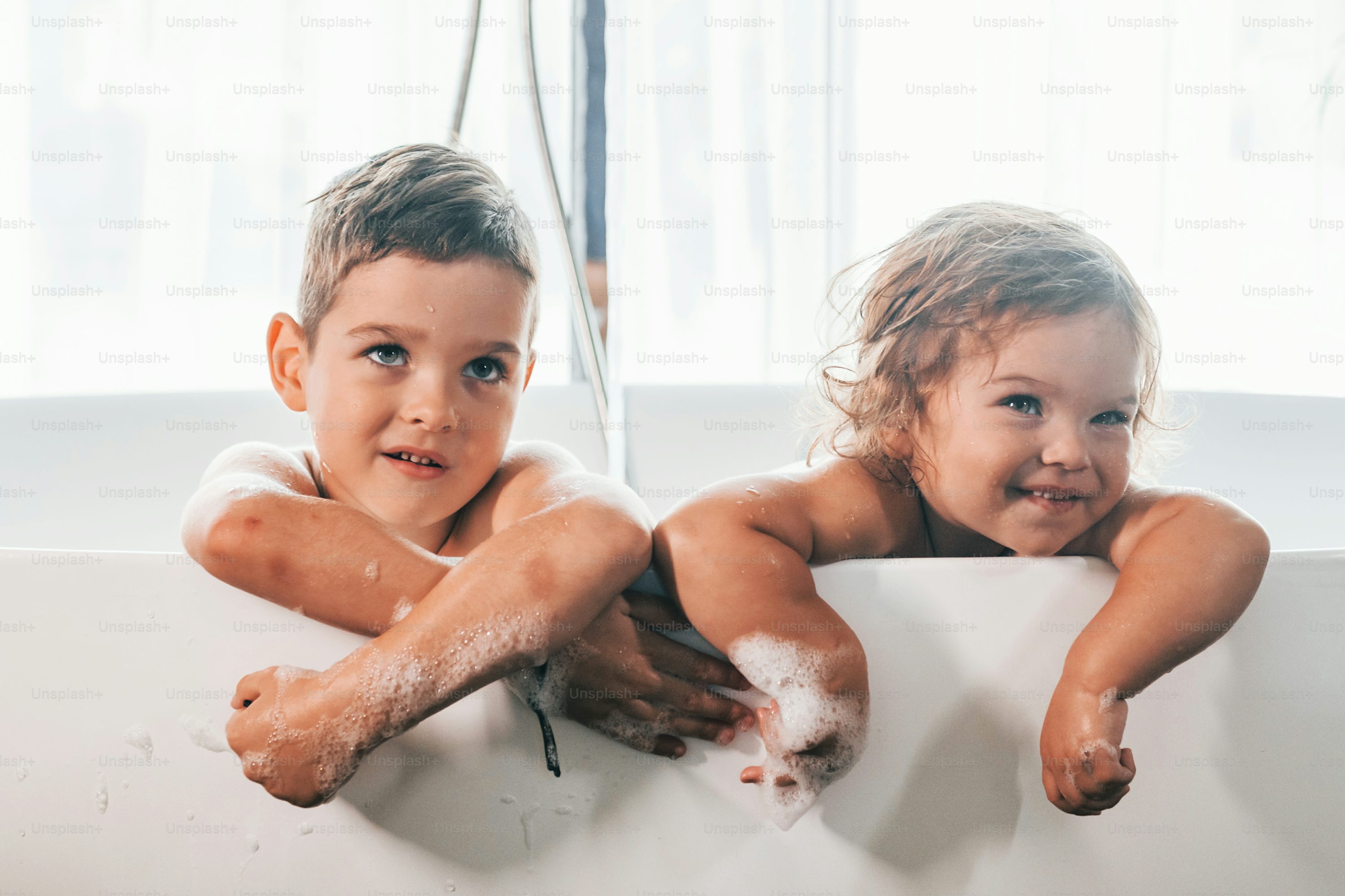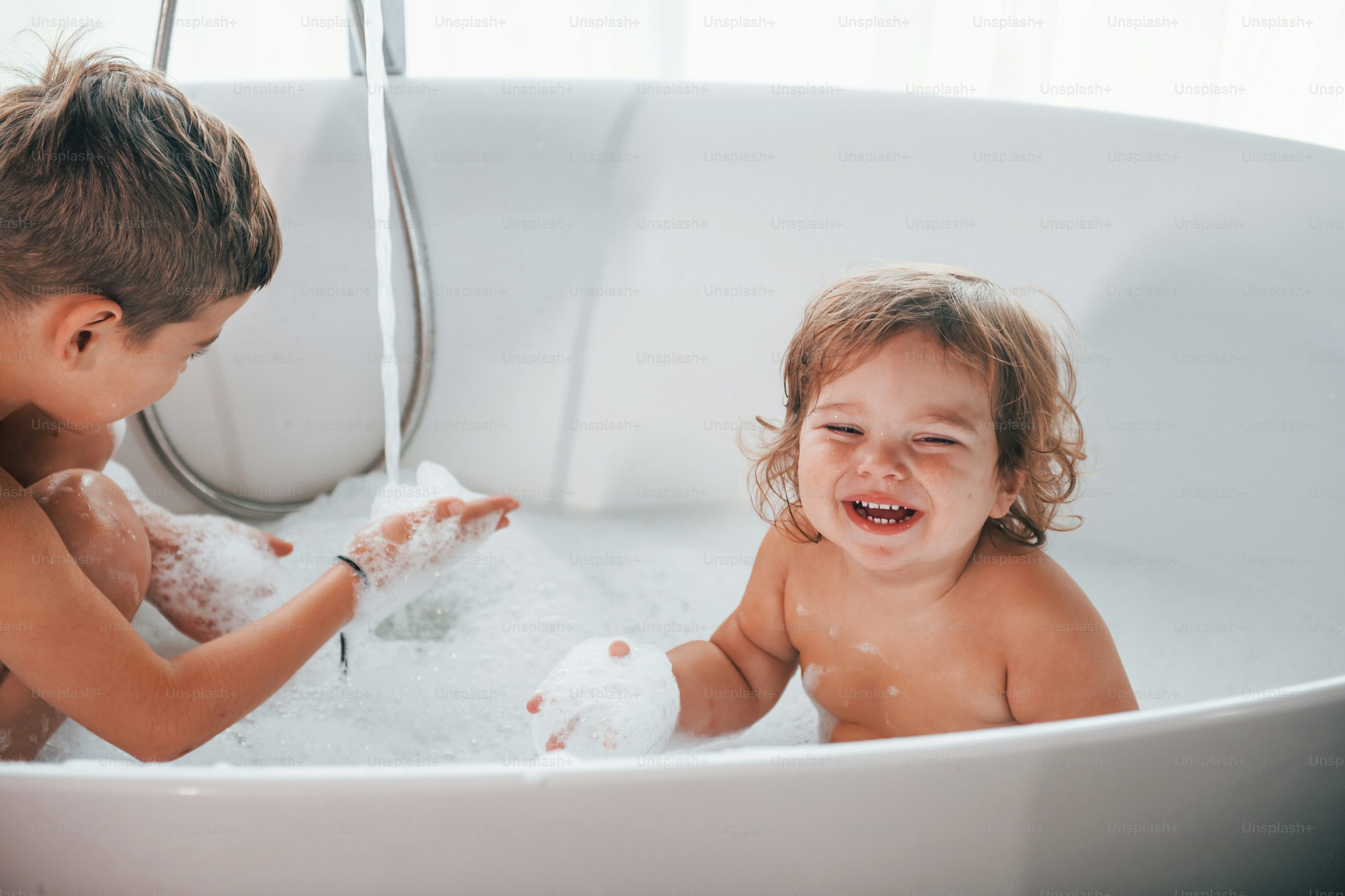自宅でお風呂で体を洗って楽しんでいる2人の子供。カメラに向かってポーズをとる。の写真 – Unsplashの赤ちゃんの画像。