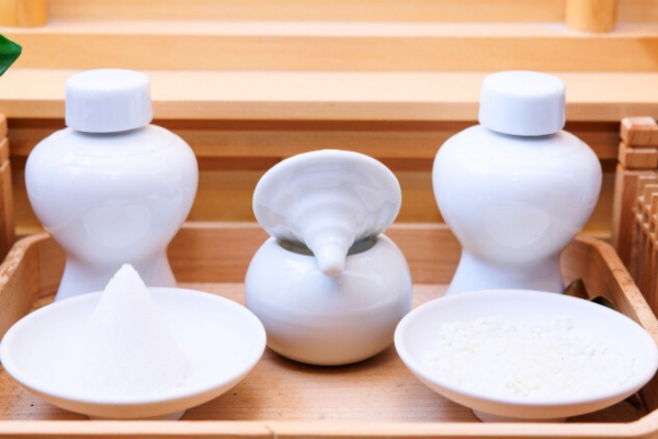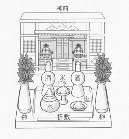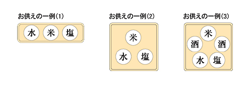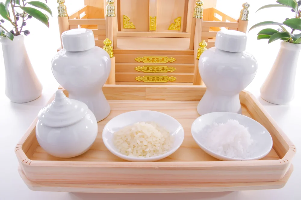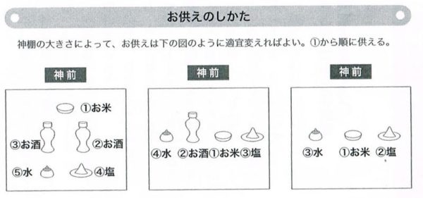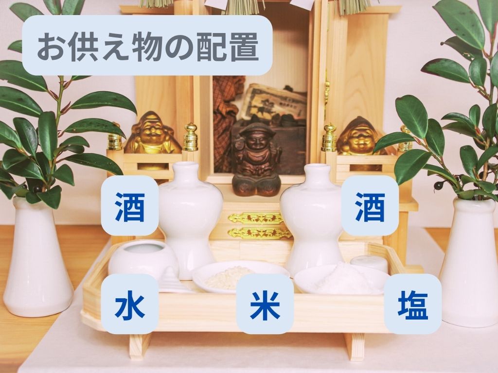 神棚のお供え物の並べ方など米や水や塩の配置を解説。