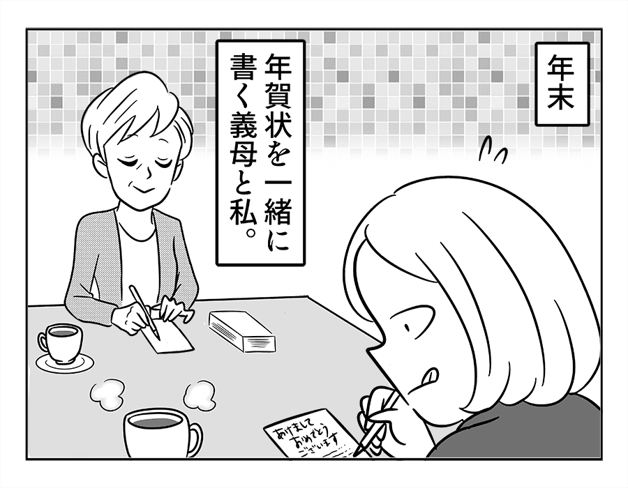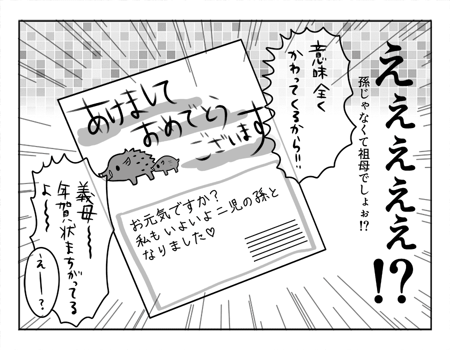 嫁ぎ先の天然家族 「孫と祖母」義母、年賀状で大失敗!全部書き直し?<第7話> 4コマ母道場ママスタセレクト。