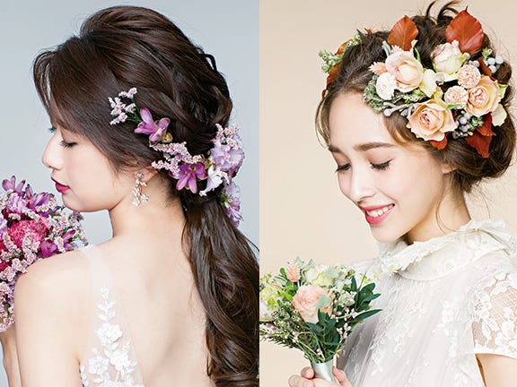 花嫁ヘアを生花でアレンジ「アップ・ポニー・ダウン」スタイル別SNAP集ゼクシィ。