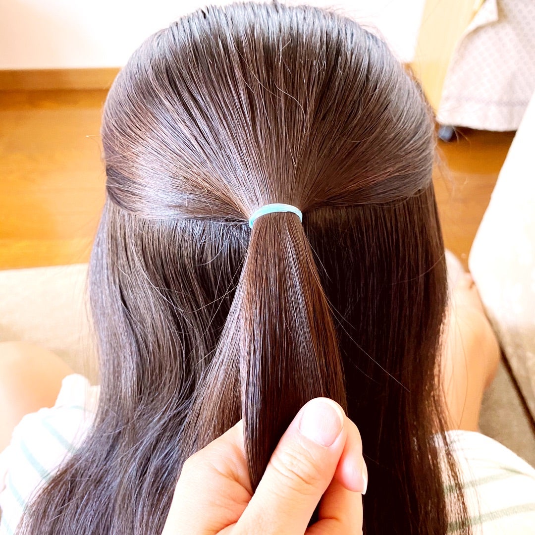 リボンでカチューシャ風のツインテールだよ🤍🖤 リボンの長さはカチューシャみたいに頭に乗せてみたとき大体髪の毛と同じくらいを用意したよ☺️👆🏻前髪がある子も前髪を下ろしててっぺんからくるりんぱしてみてね💓💓 これで公園でしっかり遊んだけど崩れにくかった。
