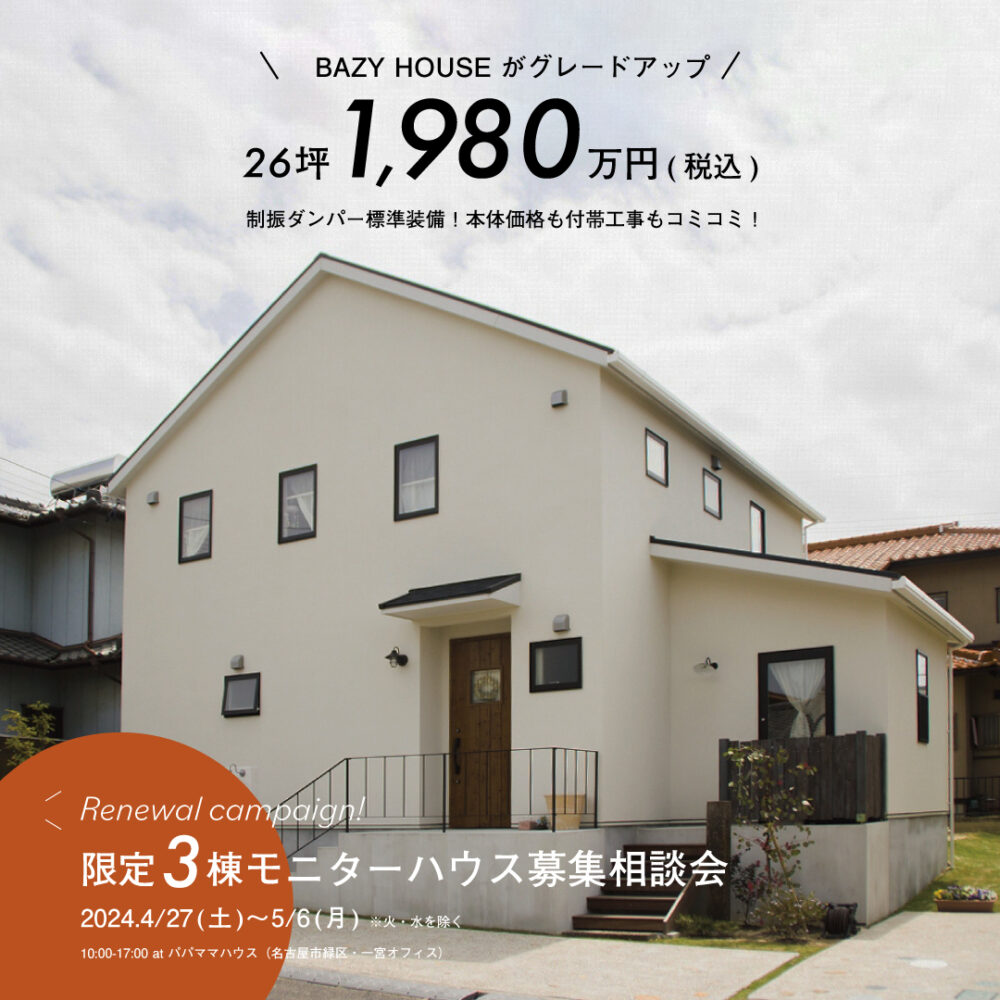 BAZY HOUSE リニューアルキャンペーン! 限定3棟 GWモニターハウス募集相談会パパママハウス。