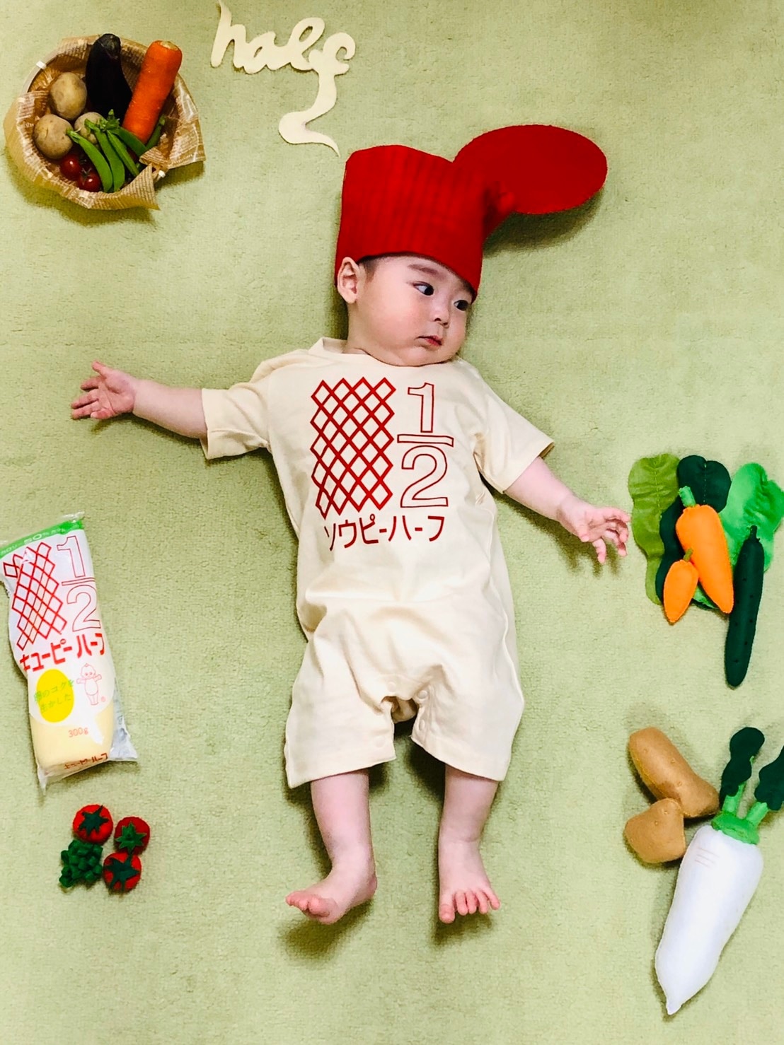 山口綾華 on Instagram: "ライピーハーフ♡ @a._______baby さんのを参考に写真撮らせてもらった🩷 ハーフバースデー とゆうことでキューピーハーフに! 野菜モリモリ食べて大きくなーれ🫶🏻赤ちゃんのいる生活 あかちゃんのいる暮らし ベビーフォト 男の子 男の子ママ。