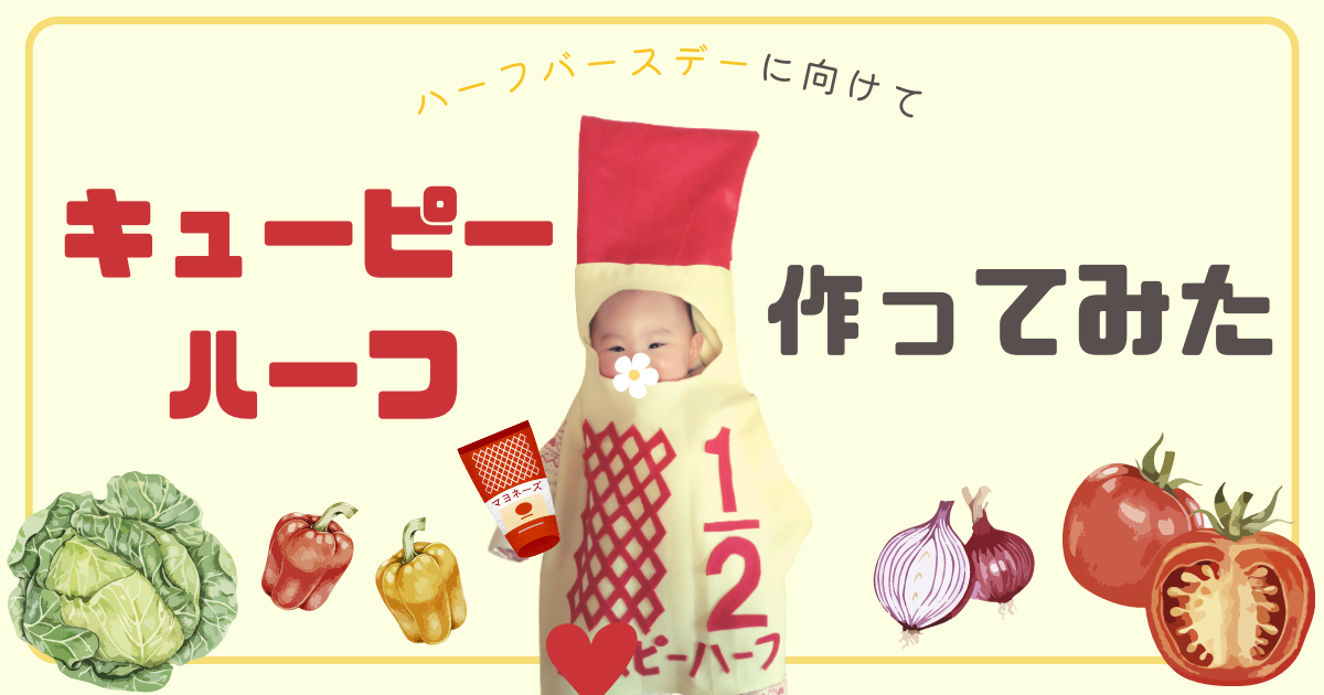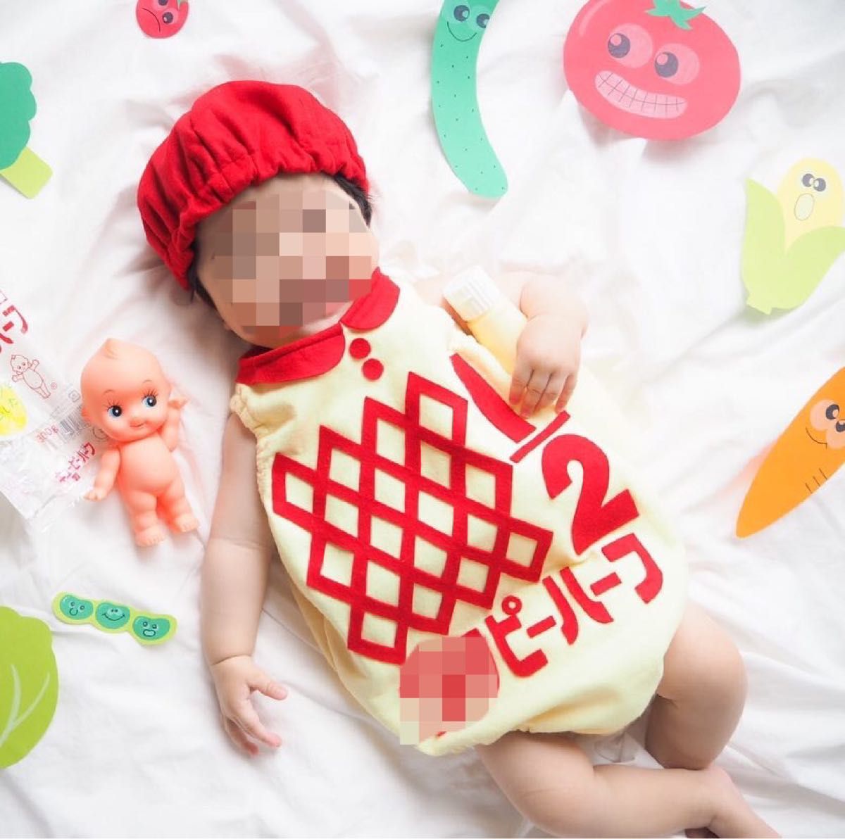 ♡ 🍅🥦🌽🍆🥕 キューピーマヨネーズになりました👶🏻 6ヶ月のハーフバースデーだったので 記念に定番衣装を手作りしておうちでセルフ撮影しました 📸 ♡ ハーフバースデーキューピーハーフhalfbirthdayハーフバースデーフォトハーフバースデー衣装。