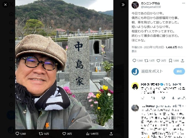 あの日から17年。相変わらず1人でやってますわ」カンニング竹山、相方の墓参りへ→「相方思い」「コンビ愛を感じます」。