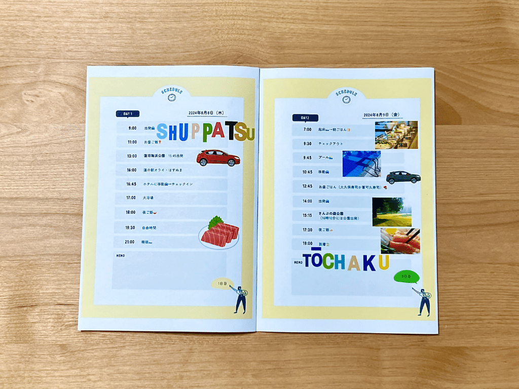 内容の面白い旅のしおりを手作り!1泊2日の家族旅行・社員旅行におすすめ・ExcelやWordで旅行日程表を簡単作成!A4。
