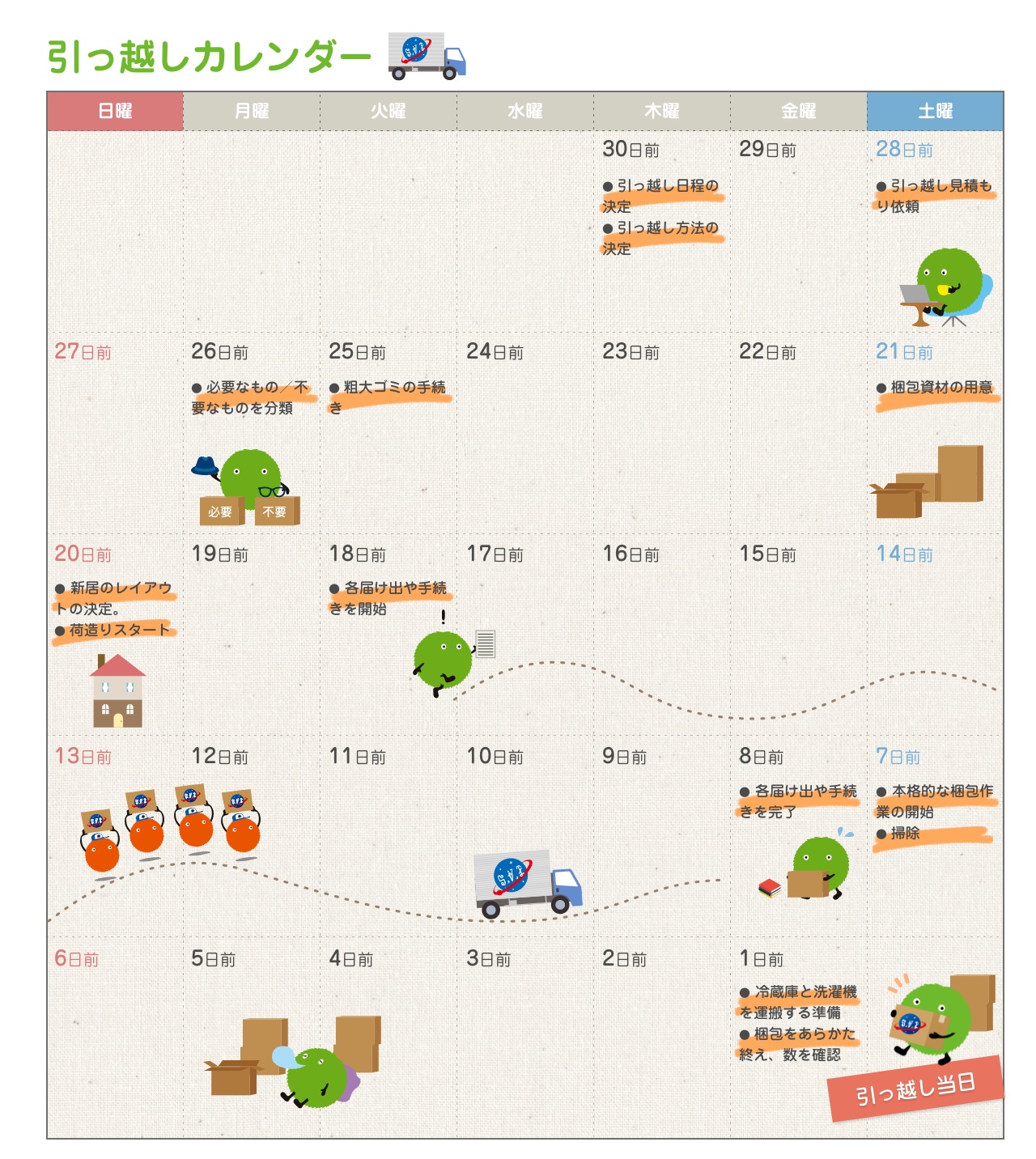 引っ越しカレンダーをつくろう! 引っ越し準備〜引越し完了まで逆算してバッチリ備える -SUUMO引越し 引っ越し見積もり 無料 や料金費用の比較サイト引越しのイロハ・お役立ち情報SUUMO引越し が引っ越しの手順、ノウハウ、手続きから準備まで完全。