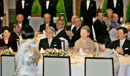 紀宮さま 後の黒田清子さん の成人を祝う茶会 乾杯する天皇、皇后両陛下、皇太子さま、紀宮さま。