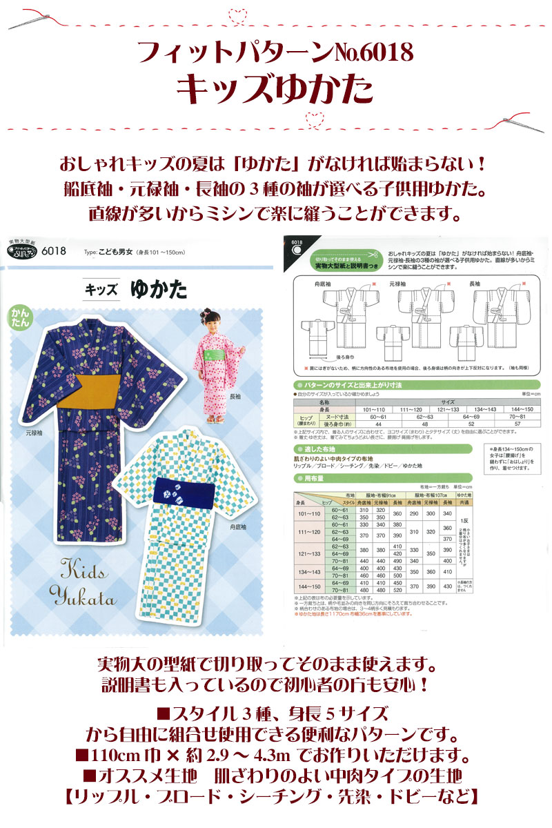 実物大・型紙 フィットパターンキッズゆかた 身長101~150cm こども 子ども 子供 男の子 女の子 サンプランニング:生地・布地のネット通販- コットンプラザ本店。