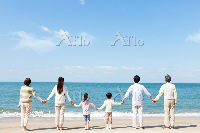 海岸で手を繋ぐ3世代家族の後姿26025292 の写真素材 - アフロ。