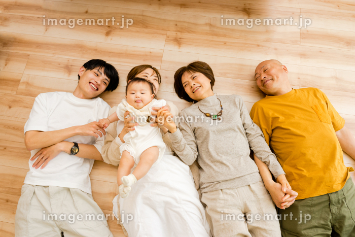 床に仰向けに寝そべり手を繋ぐ0歳の赤ちゃん含む3世帯5人の幸せで笑顔の日本人家族人物 の写真素材216151715 毎月1点無料 フリー のストックフォト イメージマート。