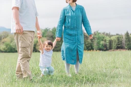 青空を背景に緑の芝の広場で手を繋ぎ遊ぶ幸せな親子3人 家族,愛情,幸せなイメージ 写真素材7024488- フォトライブラリ。