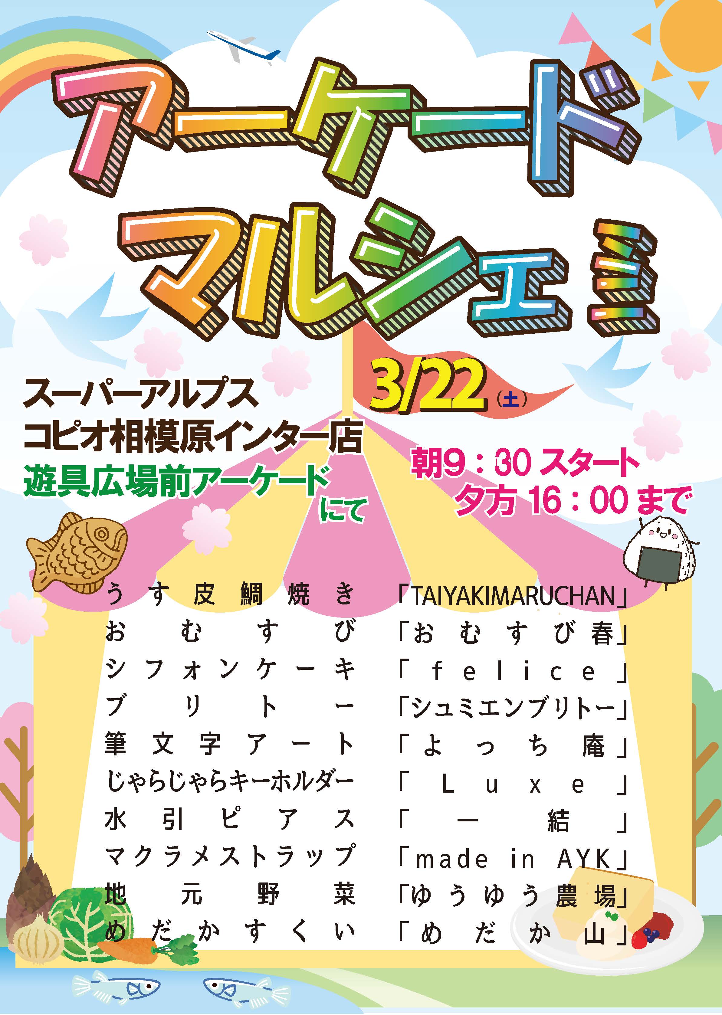 スーパーアルプス公式 on X: "🌟3 22 土アーケードマルシェ開催のお知らせ🌟 スーパーアルプスコピオ相模原インター店遊具広場前アーケードにて マルシェを開催いたします✨ 日時:3 22 土 朝9:30スタート、夕方16:00まで <出展情報> うす皮鯛焼き・おむすび。