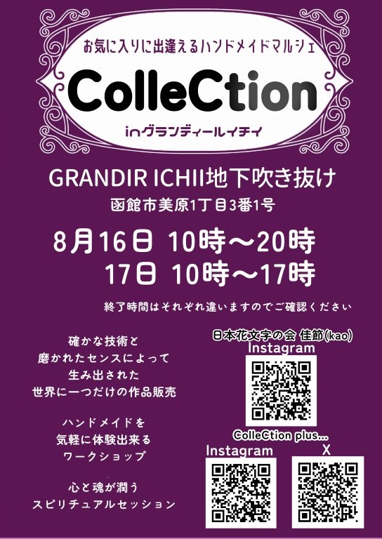 2025 8 16~17 お気に入りに出逢えるハンドメイドマルシェ「ColleCtion in グランディールイチイ」函館イベント情報局。